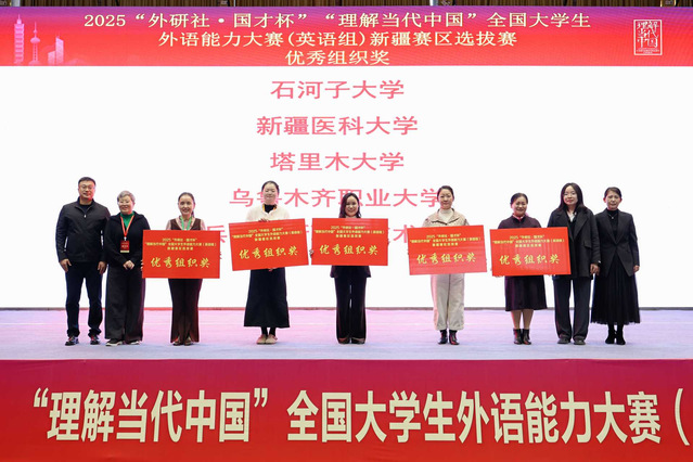 11月1日至2日,由新疆维吾尔自治区教育厅、兵团教育局主办,石河子大学承办的2025年“外研社·国才杯”“理解当代中国”全国大学生外语能力大赛(英语组)新疆赛区选拔赛在我校圆满落幕。教育部高等学校外国语言文学类专业教学指导委员会主任委员孙有中,新疆生产建设兵团教育局党组成员、副局长赵首辰,石河子大学党委副书记、校长李兆敏,新疆高校外语教学研究会会长曹湘洪参加大赛并致辞。